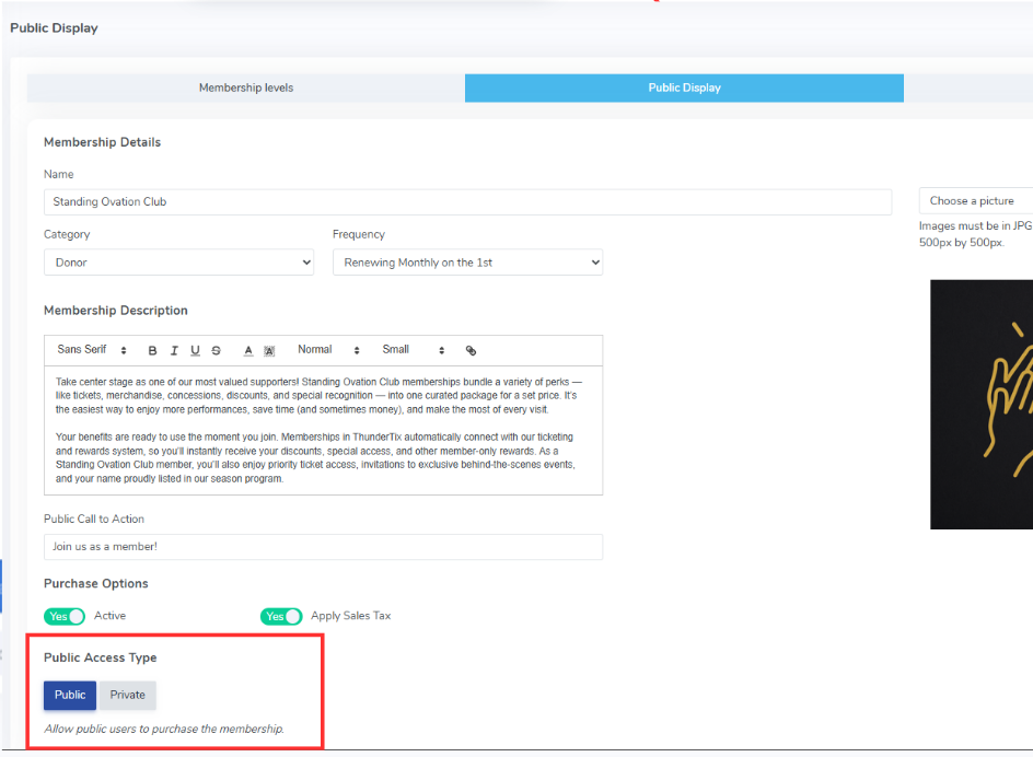 If you want your patrons to be able to purchase a membership on your public site, you will click the "Public" option on Public Access Type.