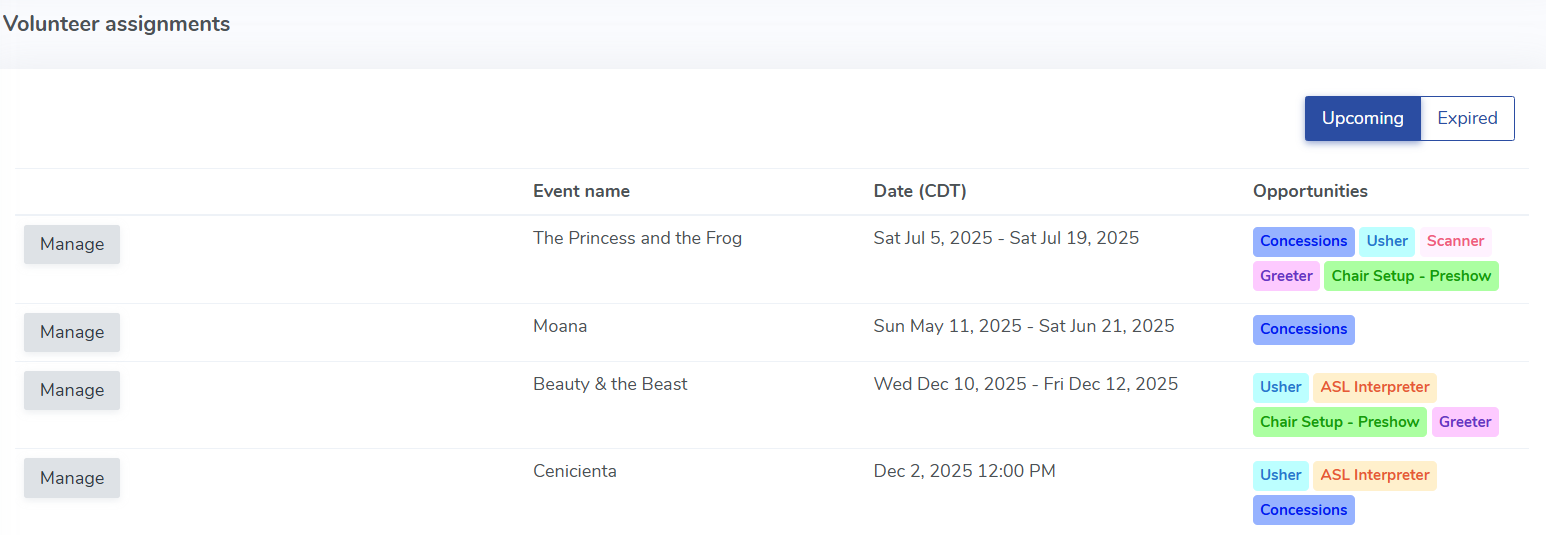 - Navigate to the Volunteer Management tab > Volunteer Assignments> click Manage on the event where you would like to add a volunteer opportunity. If no opportunities have been assigned to your event your s