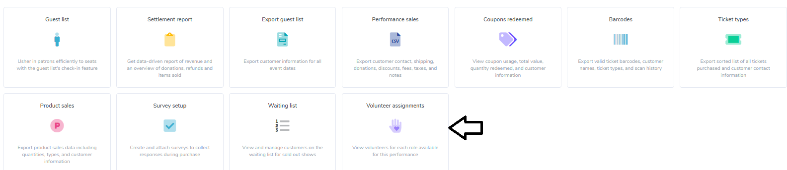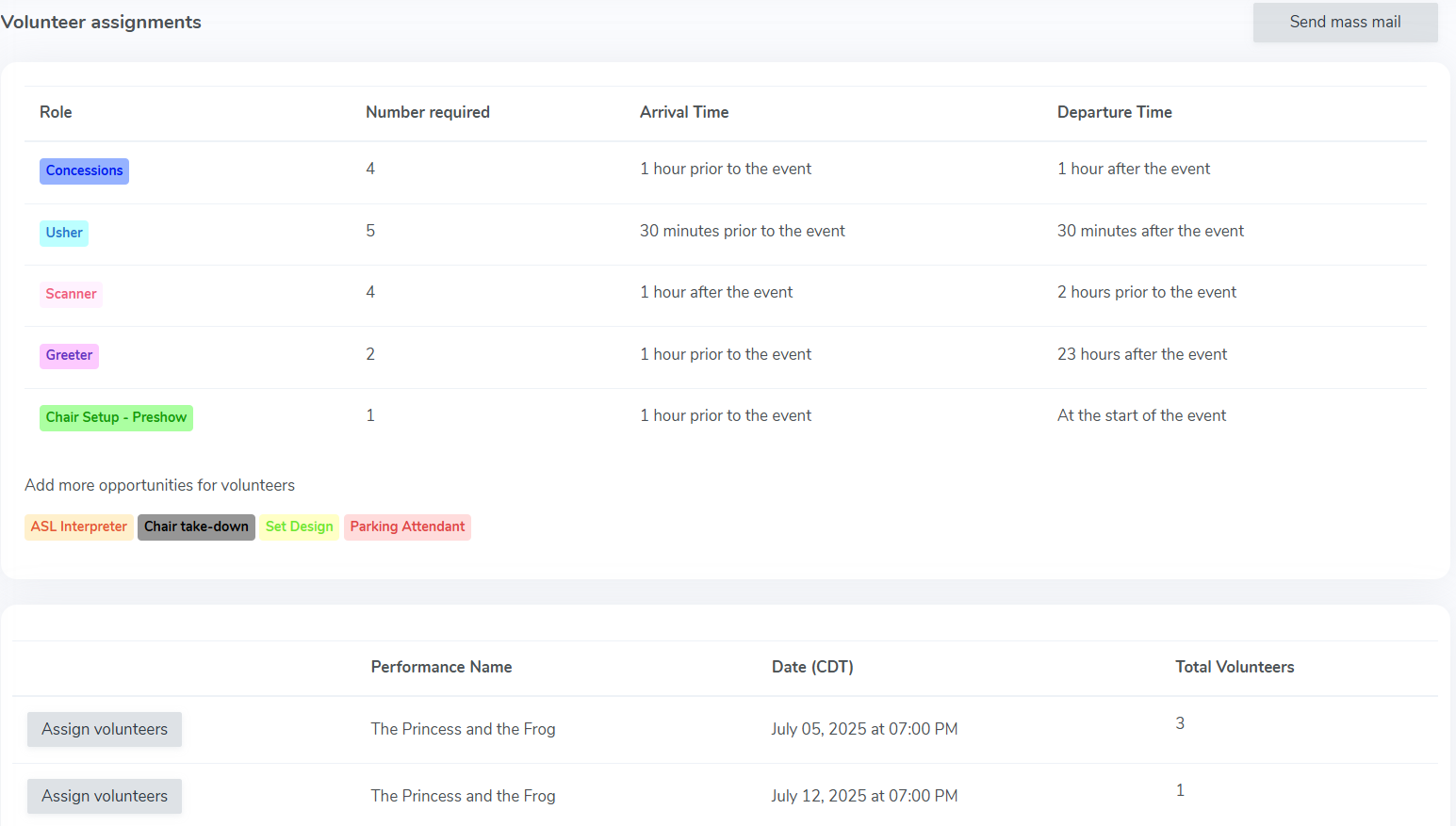 - Click on the 'Assign volunteers' button to assign volunteers to each performance.