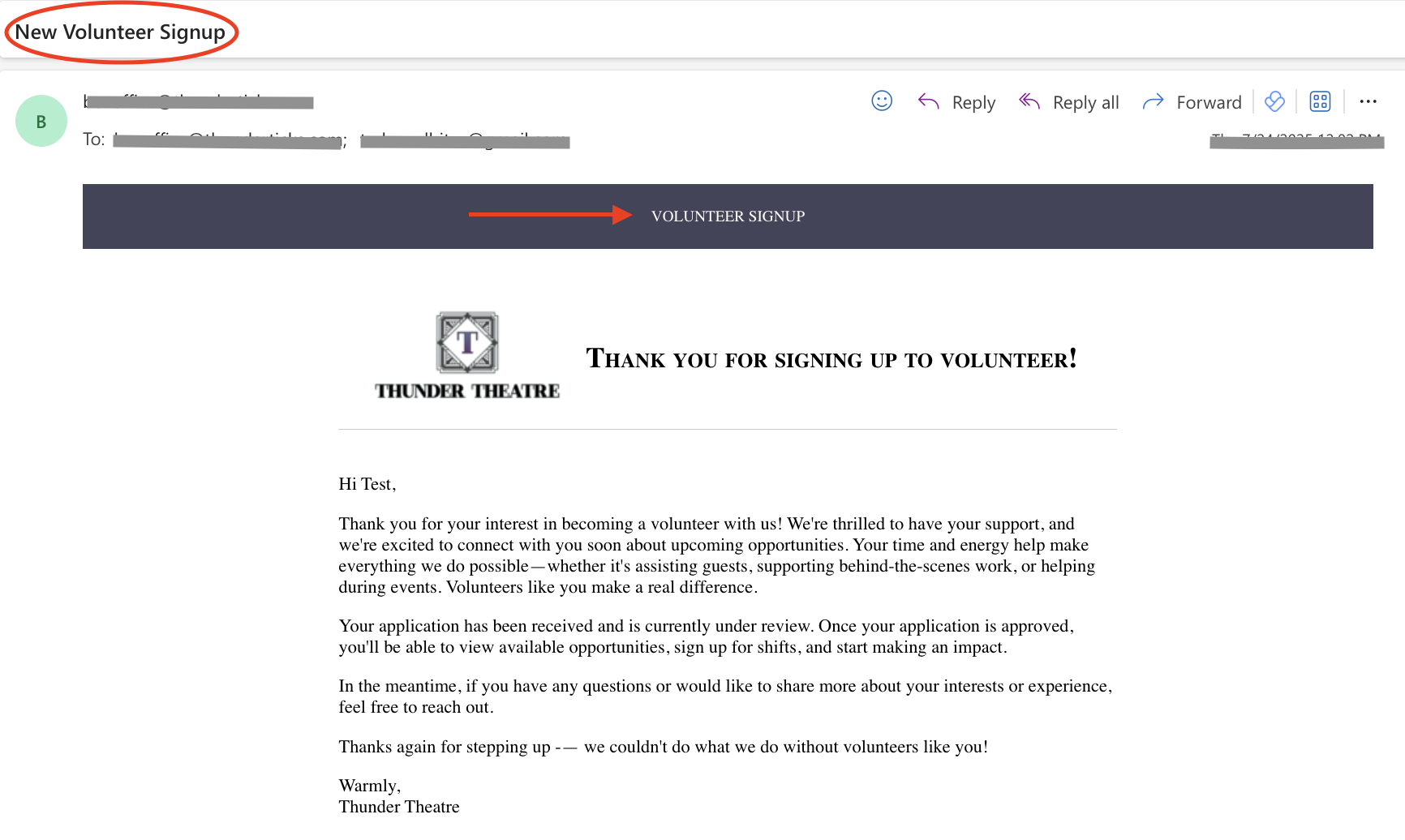 Once a volunteer has signed up, you, as the admin, will receive the following notification via email. The subject will be New Volunteer Signup: