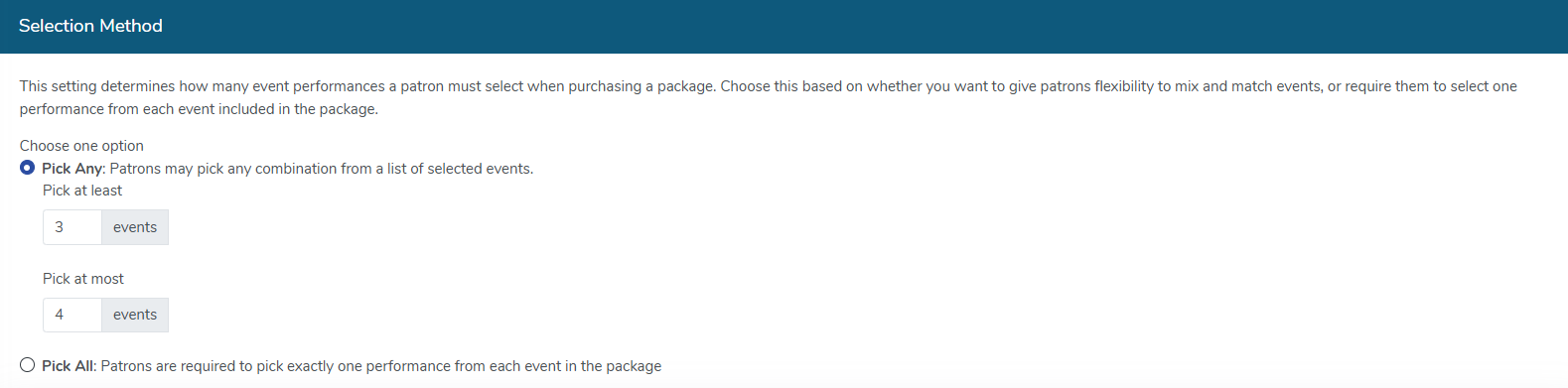 - Enter a minimum number of events the customer must select when buying the package in the Pick at least box