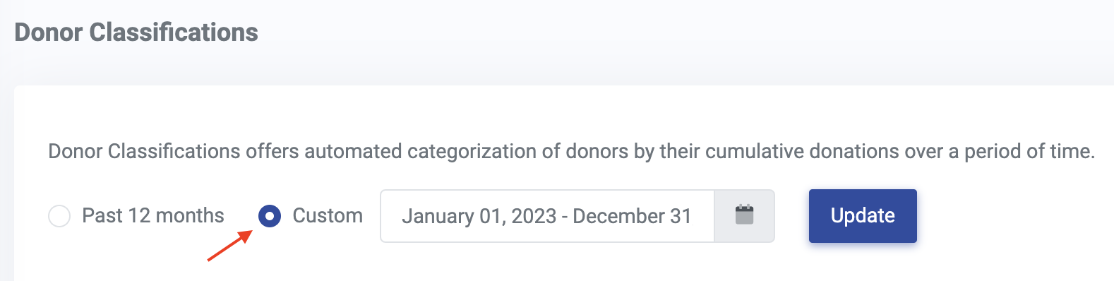 To use a rolling 12-month period, choose the "Past 12 months" option. To use a custom timeframe, choose the "Custom" option and enter your preferred custom date range to view All Donors from your defined Donor Classifications. Head to Giving > Donor Classification to customize your dates.