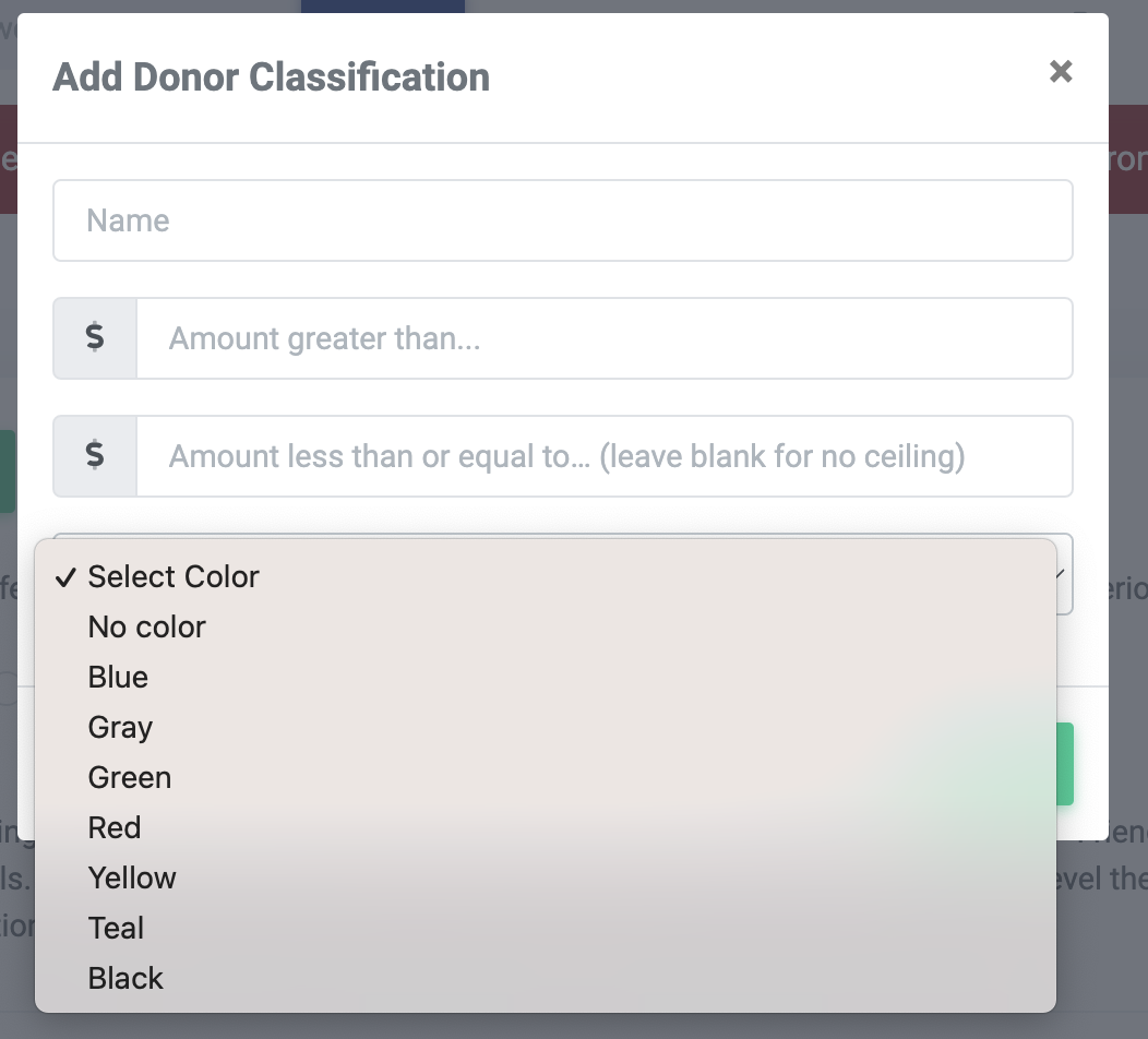 To associate each classification with its own color, you can head to Giving > Donor Classifications > +Add Classification > fill out the name and amounts > use the "Select Color" dropdown to choose a color > click the green "Create" button.