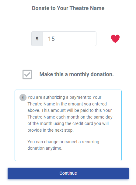 Patrons may elect to make their donations monthly recurring by simply checking a box at the time of ticket purchase or via a separate Fundraising Campaign. We'll first process the original donation at the time of order. Then, we'll create a schedule for future orders to cover the upcoming months. Recurring donations will automatically happen on the same day of each month.