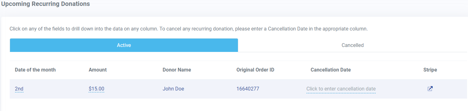 From the Recurring Donations tab, you can view all recurring donations, edit the amount of a donation, change the day of the month or suspend the recurring donation at any time.