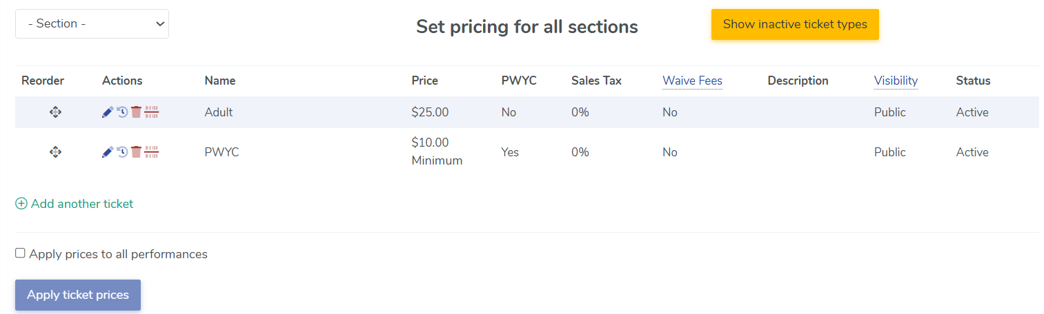 To add a new PWYC ticket, click on the name of your Event, locate the performance you want to offer PWYC tickets for, click Select then click "Manage Tickets and Prices". Click the "Add Another Ticket" link. Add your new ticket by creating a name, adding a minimum price, and checking the box for PWYC. This will allow customers to select this ticket option for purchase as long as they meet the minimum price you request. (Logged in users can override even this minimum at checkout.)