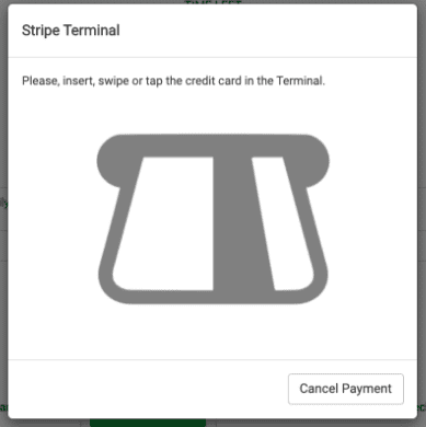 The Terminal is ready for you to process a payment with a credit card in-hand. Make sure you've entered the patron's contact information including their email address prior to processing payment. Once that's done, click "Checkout". You'll see the image as shown below. At this point, ThunderTix is ready for you to insert, swipe, or tap the credit card to your Stripe Terminal. Processing the card with the EMV reader (inserting it) will provide better protection against fraud for your venue, so make sure you choose that option over swiping it.
