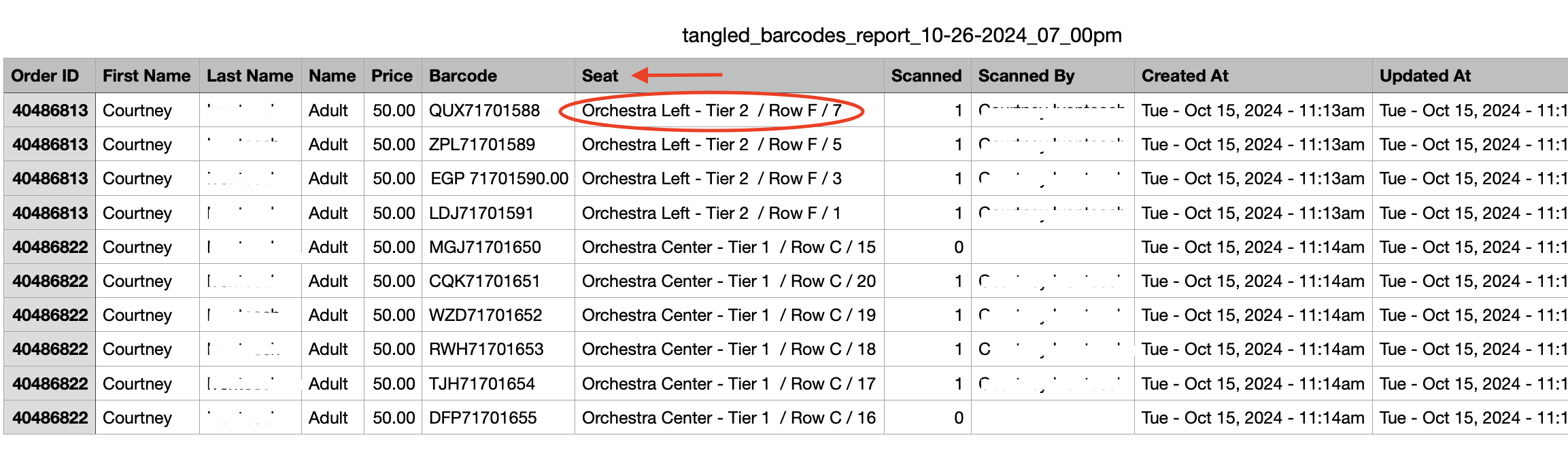 What's included in the Barcode Export: 1. Order ID2. First and Last Name3. Name of ticket type4. Price5. Barcode ID6. Seat assignments for each barcode7. The number of times the barcode has been scanned8. Who scanned the barcode9. The timestamp for when the barcode was originally generated10. The timestamp for when the barcode was updated which means the time it was scanned11. Customer email Barcode Scan report Use this report if you want to see a summary of the total barcodes scanned per event as well as per person that was scanning tickets. We'll also summarize the number of barcodes scanned per ticket type and show any tickets that have not been scanned in for the event.