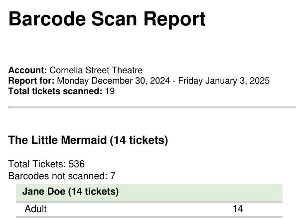 We provide an automatically compiled report of all barcode scans in a few ways. The guest list provides an up to the minute count of barcodes scanned and how many are remaining. The export is a CSV of all alpha-numeric barcodes for each performance. Finally, the Barcode Scan report provides a high-level overview of how many barcodes were scanned in a given day by each staff member or volunteer. Guest List