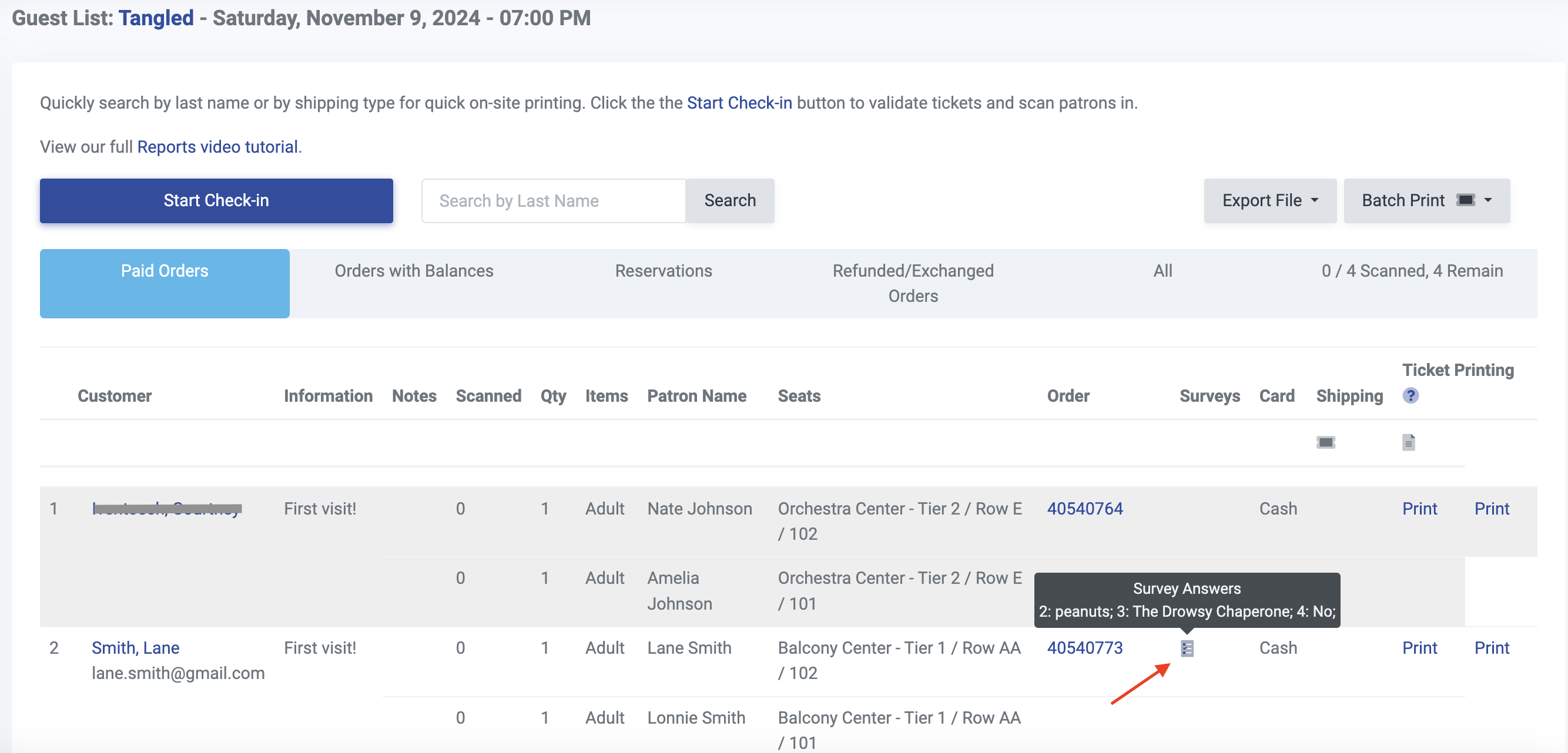 Survey results collected during checkout are also included in your guest list. Whenever a customer submits answers to a checkout survey, we will include it in the guest list as a survey icon as seen below.