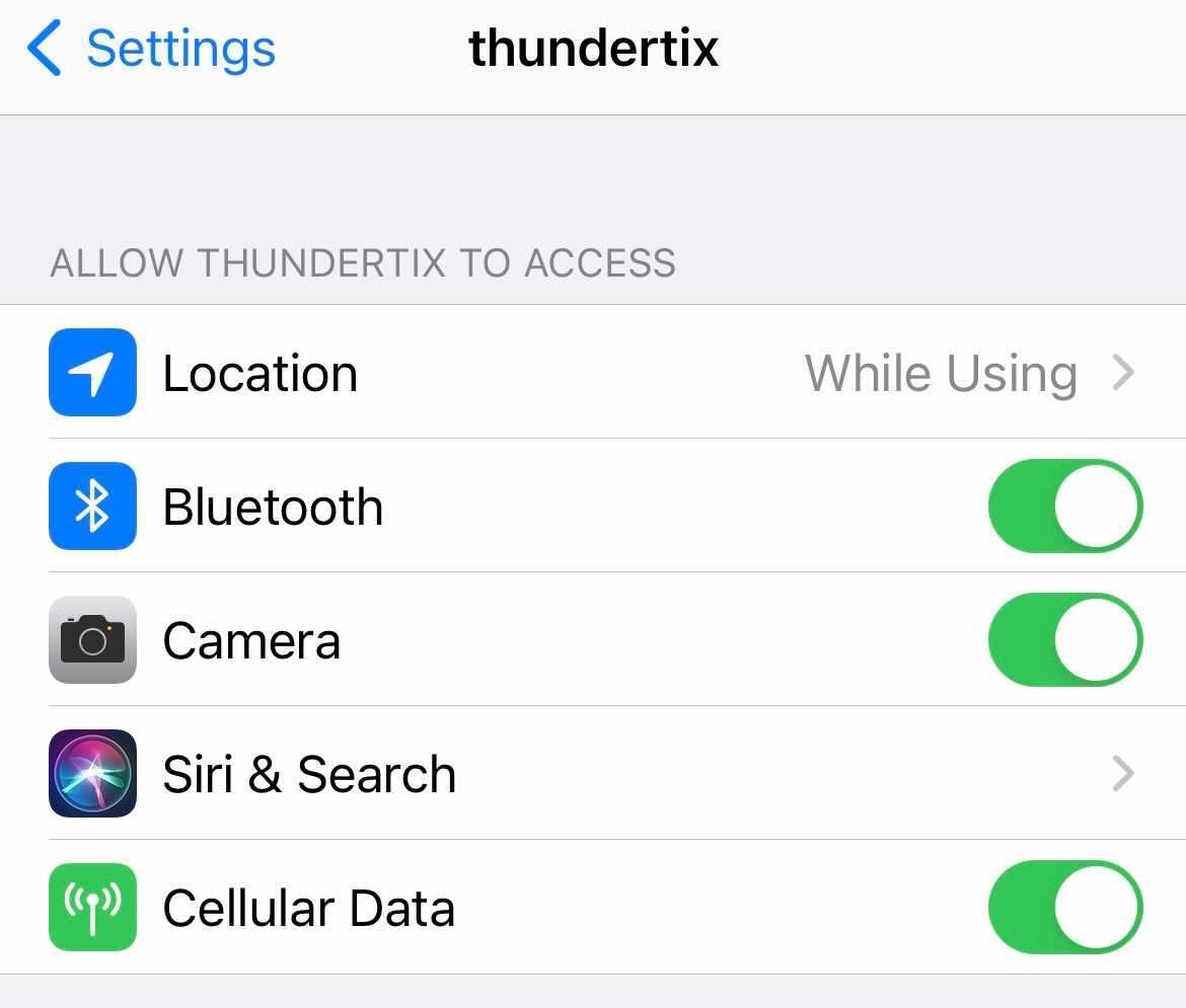 Please have each person that will be scanning check the settings for the ThunderTix App to ensure the Camera is enabled. See the image below.