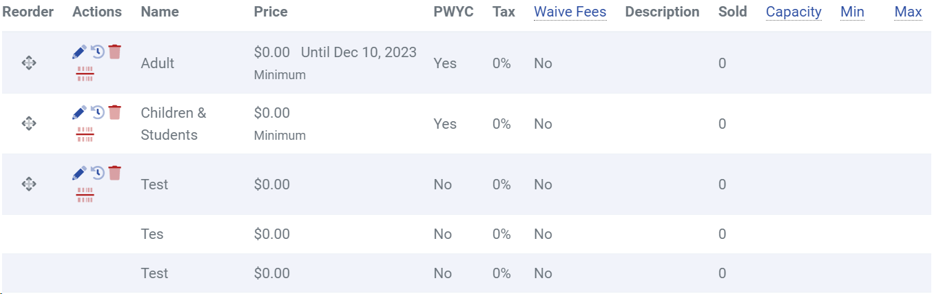 You can create as many tickets as you need, and once created is set to Active by default. If you later decide to remove a ticket, we do not delete the ticket but rather inactivate the ticket. This is to ensure we retain the ticket pricing history, so if you want to review an order, we show the details of those once active tickets.