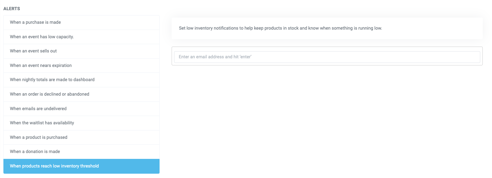 Sign up for email notifications that alert you when your product reaches the defined low inventory point. Follow the steps below to sign up for this notification: