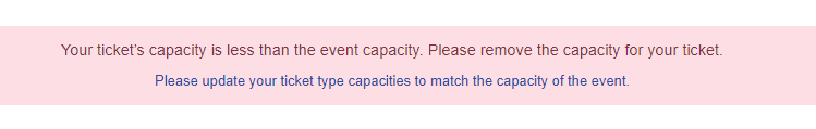 If you have set a capacity on your tickets and they do not match the capacity you have set for your event, you will receive the below message: