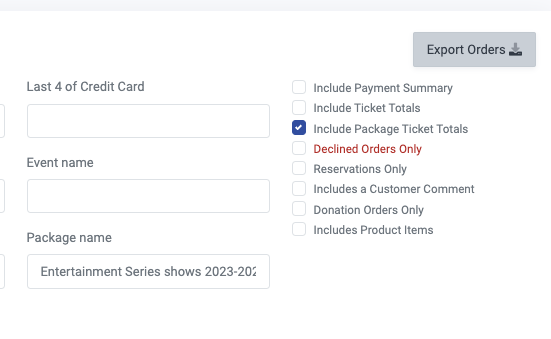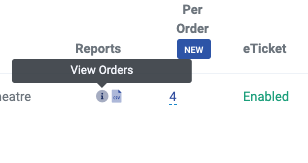 The second icon under Reports is to download a CSV of all orders and individual tickets generated for each of the performances included in the package. See below