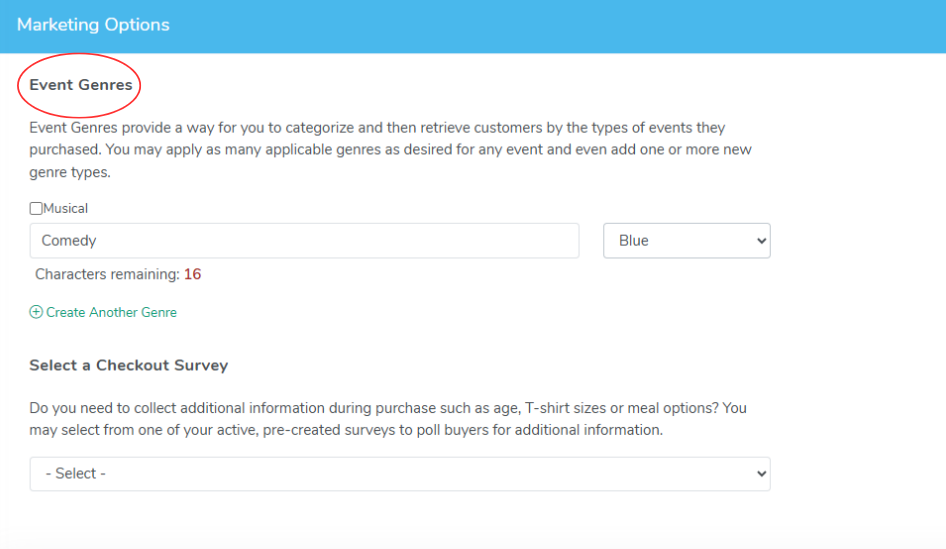 1. After selecting Create Event, expand the Marketing Options tab 2. If you have existing genres, select the checkbox to the left of the genre to apply it to the event 3. To create a new genre, type the name in the text field 4. To create more than one genre, select the + Create Another Genre