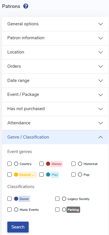 1. Navigate to: Patron Database>CRM & Mass Mail. Click on the "Genre/Classification" Tab. 2. There are two options for searching your CRM for purchasers of different genres: use the Genre/Classification search to find any purchasers of a given genre or genres over the entire history of events.