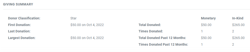 After entering the donation, you'll see the Giving Summary on the patron record update for the total value of In-Kind contributions over time.