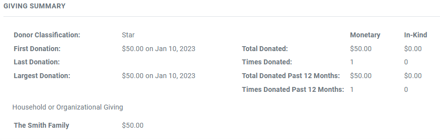 For patron records that are added to households, the Giving Summary will update to show all donations made from patrons in that household.