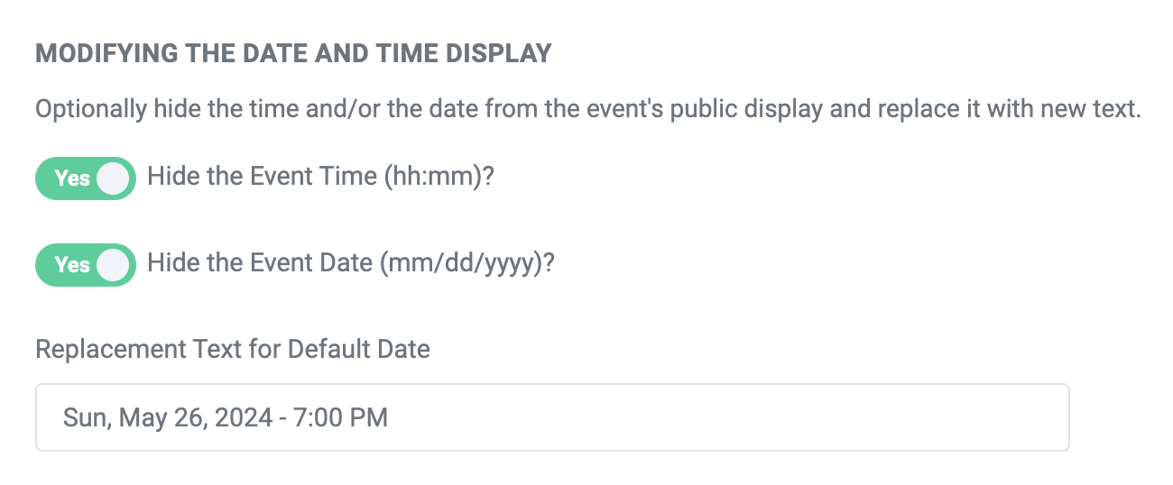 - Use the field below these boxes to enter replacement text. This would be something like "May 26, 2024 - 7:00PM" or if you also want to include the day of the week, you might change it to something like this: "Sun, May 26, 2024 - 7:00 PM"