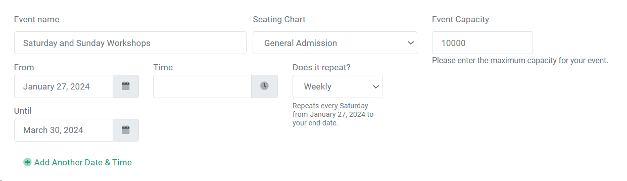 - Add Event Dates, and Does it repeat, again select "Weekly"