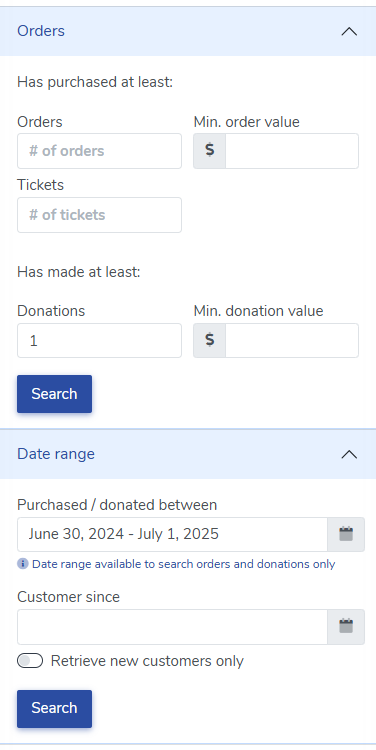 The Orders tab allows you to search for donors and their single donation amounts made within a specified date range. To get a list of donors and their single donation amounts, navigate to: