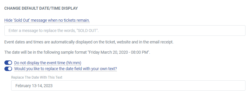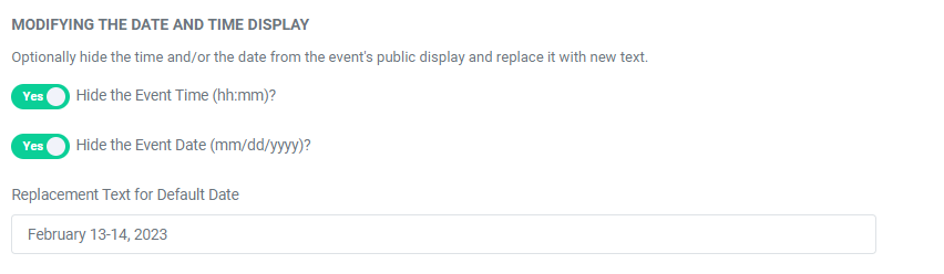 - Head to the Advanced Date Display Options tab, under CHANGE DEFAULT DATE/TIME DISPLAY change the toggles both the "Do not display the event time" and "Would you like to replace the date field with your own text?".