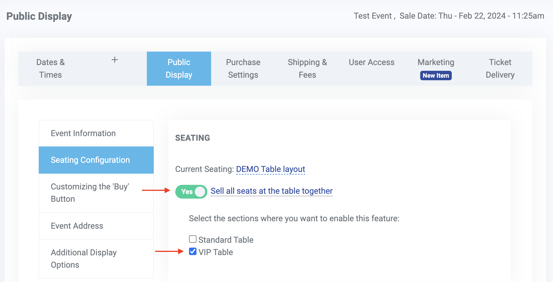 Set-up: For events using a seating chart that includes tables, you have the option to turn this function on. To do so, click on the name of your event >> Public Display >> Seating Configuration >> SEATING >> turn the "Sell all seats at the table together" toggle to "Yes." This will then provide a list of the sections where you can enable this feature. Choose the appropriate sections by checking the box. You'll see a green "Saved!" message pop up, indicating your changes were saved.
