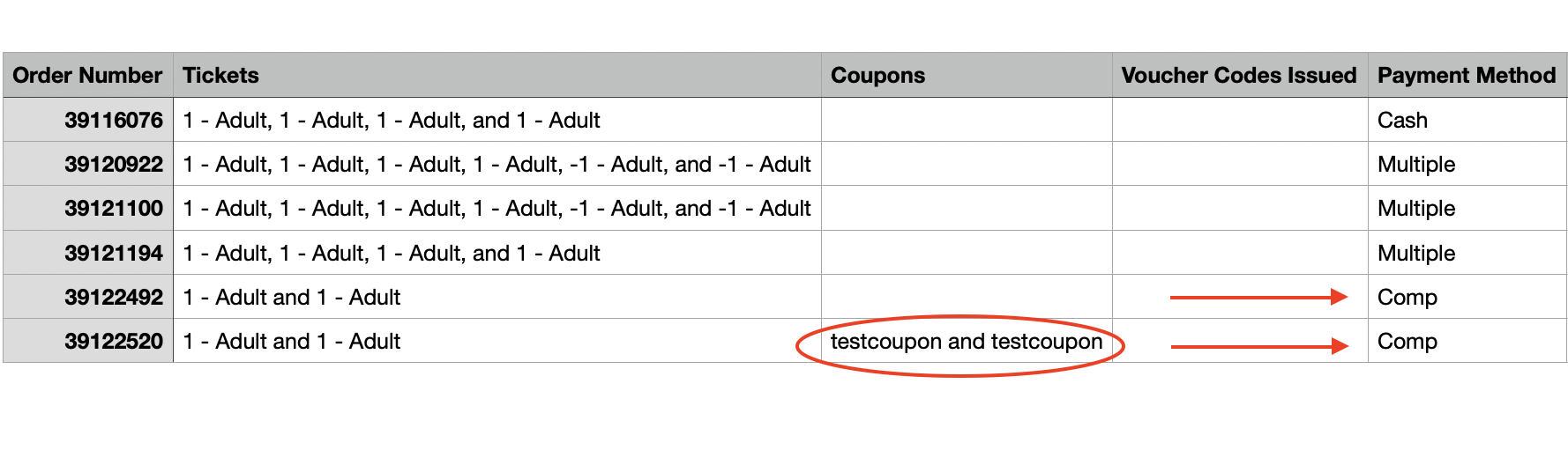 In this test example, Order 39122492 was comped using "COMP" and Order 39122520 was comped using a "COUPON" (for 100% off per order). In the export, we now have the "Coupons" column, which shows the specific coupon(s) used to comp the order. So, while they both say "comp" in the Payment Method column, we now can quickly and easily see that Order 39122520 was comped using the coupon "testcoupon", as seen in the Coupons column: