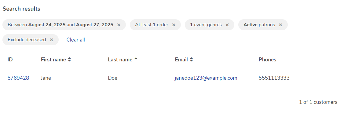 The example above shows a search for all patrons that purchased tickets for the 'Comedy' genre from August 24th-August 27th 2025.