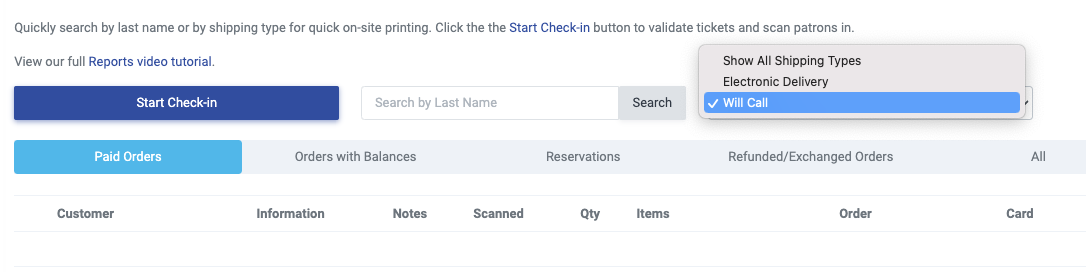 If you have multiple shipping options for your event (Print at Home, Will Call, Postal Mail, etc), you may want to print only tickets of a certain shipping type. From your guest list, choose the desired Shipping Type to show only tickets of that type. See the image below.