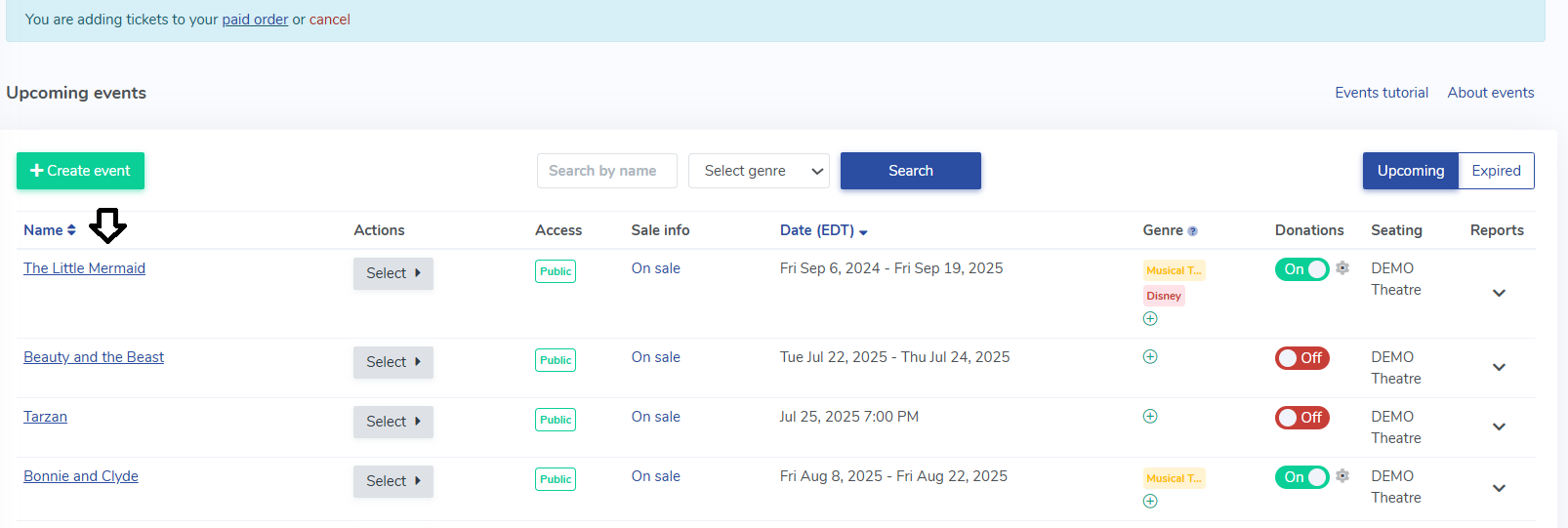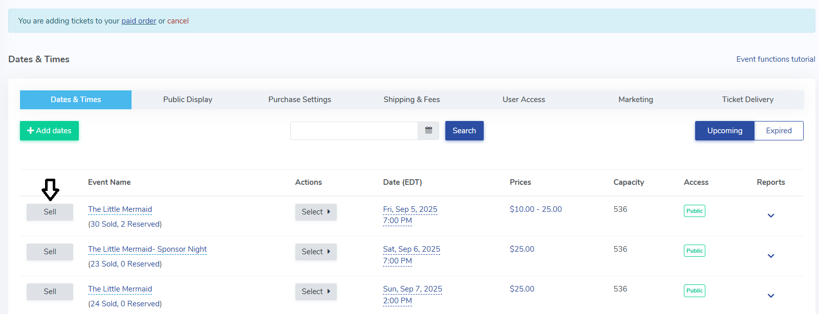 3. Click on "Sell" for the performance date/time you'd like to add tickets to.