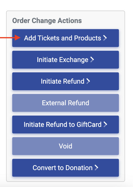 1. From the Order, click on the "Add Tickets and Products" button in the Order Change Actions box. 2. Choose the event for which you would like to add tickets to the order and click on the name of that event.