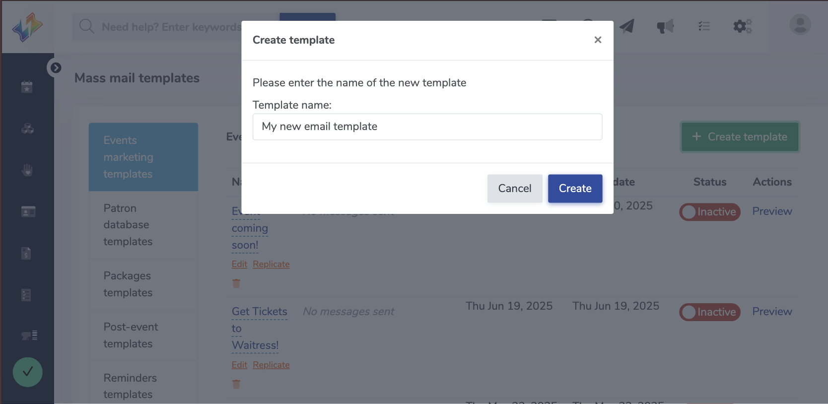 2. Once you have chosen where you want to send a mass email from (your Patron Database, Events, or Packages), you will be prompted to use or create a new template. A template is a design that holds information such as URLs, images or text content. We'll get started by naming our template, so we can find it easily in the future, then click "Create".
