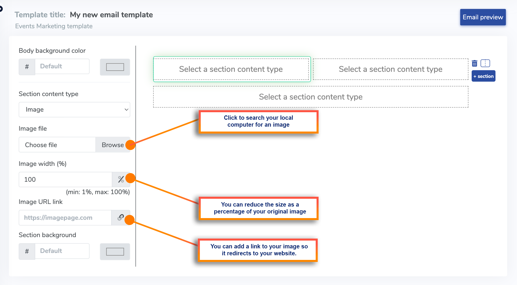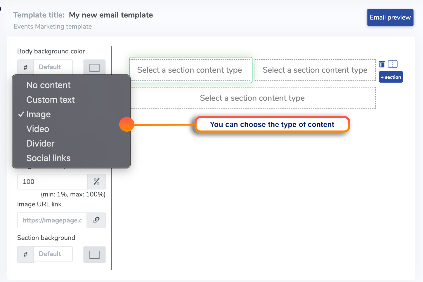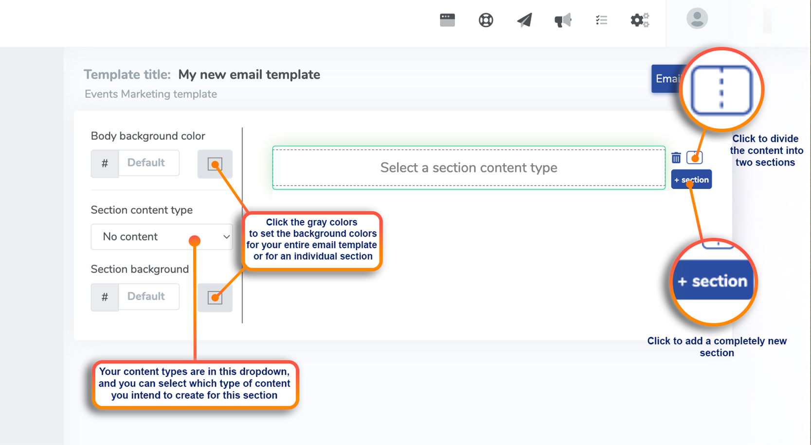 3. Below, we've highlighted some of the important parts of your template such as adding sections and dividers, creating background and section colors, and content types (image, custom text, social links, etc.)