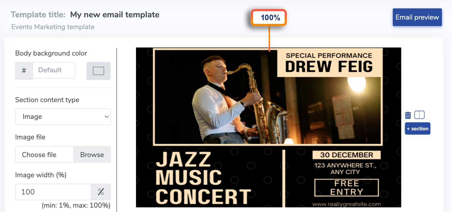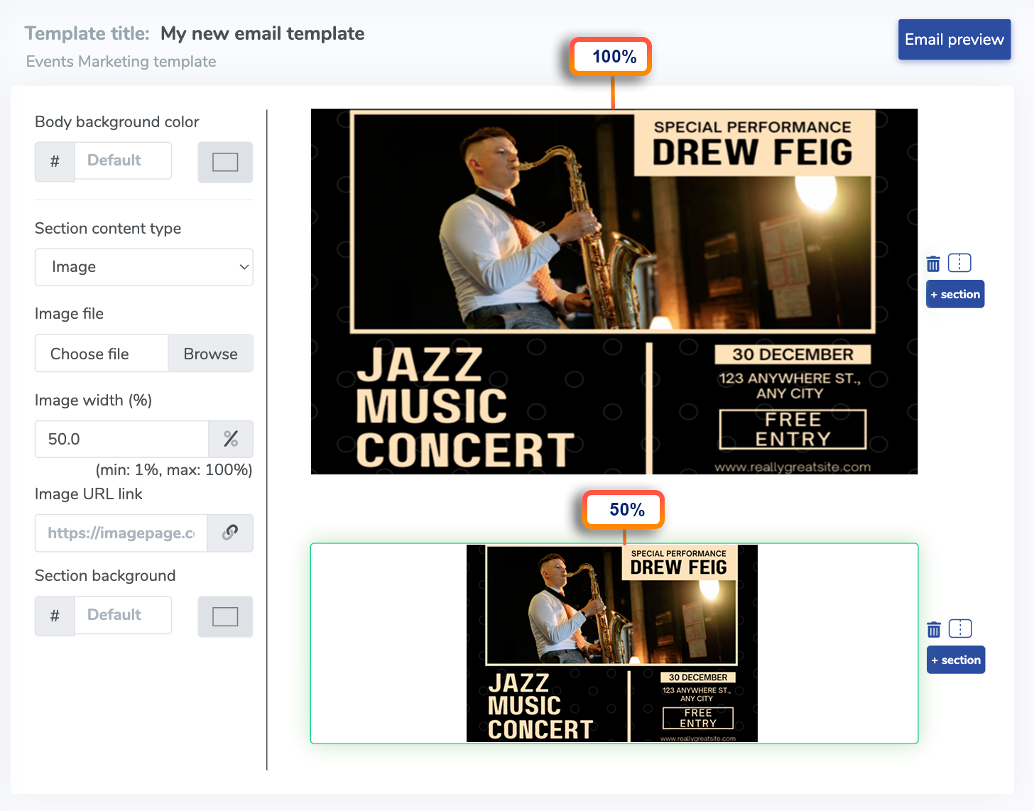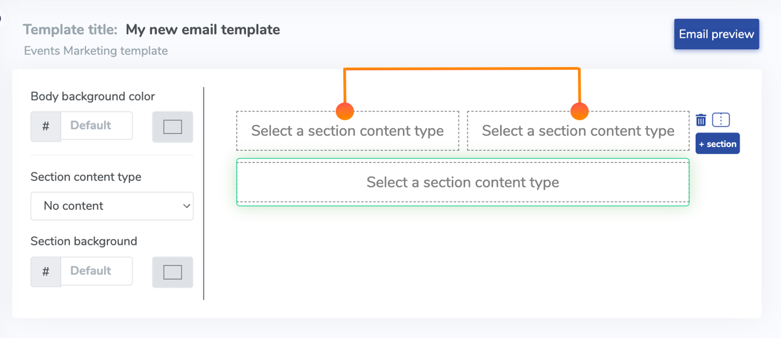 3. Below, we've highlighted some of the important parts of your template such as adding sections and dividers, creating background and section colors, and content types (image, custom text, social links, etc.)