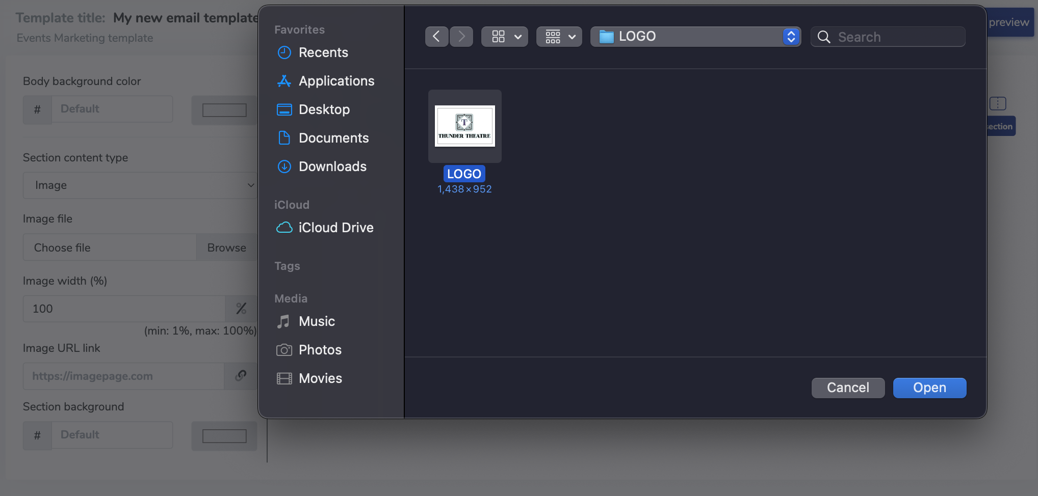 7. Find your image and click open. Make sure that you click 'Save Changes' in your Section content.