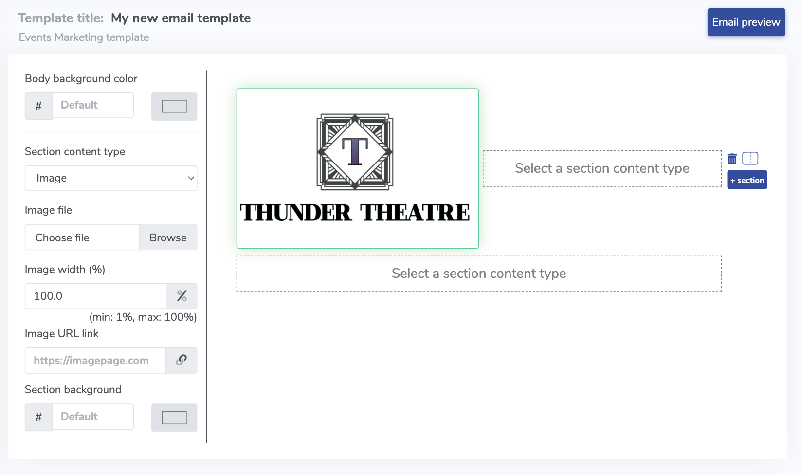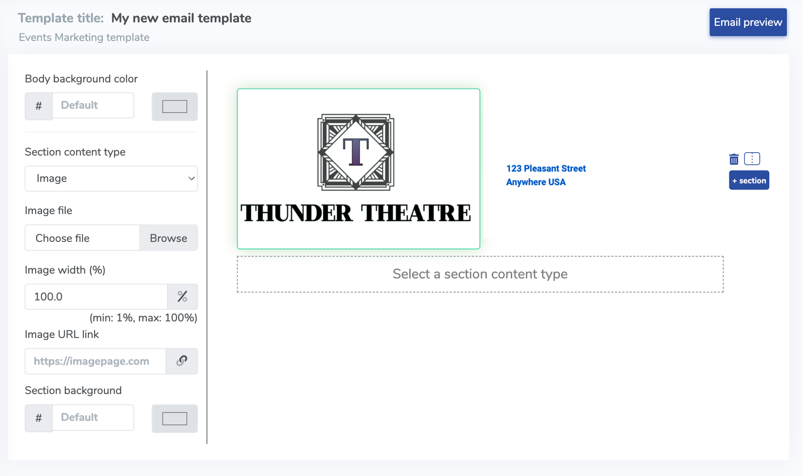 5. Click any of the three areas to highlight it in green as shown above. Please note that you will need to click on each section to edit it. Let's click the first half of row one to add a logo by selecting "Image" in Section Content Type.