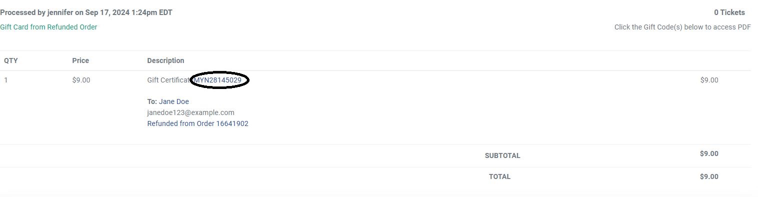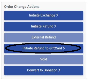 - To convert the unapplied credit to a gift card, head into the order and select 'Initiate Refund to GiftCard' from the Order Change Actions Menu.