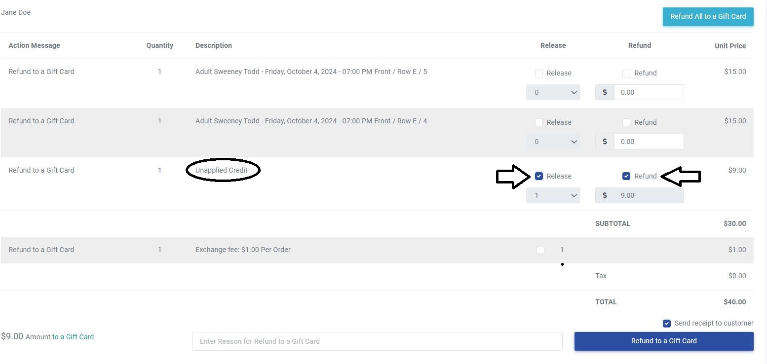 You will be redirected to the following screen: - Make sure to check both the Release and Refund checkboxes to refund the unapplied credit to the Gift Card. Finally, just click the Refund to a Gift Card button at the bottom to complete the transaction.