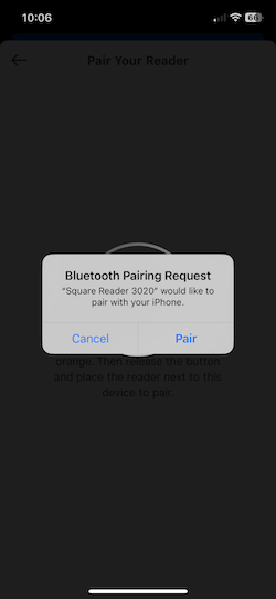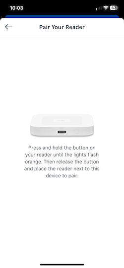 Follow the instructions to turn on and pair the Reader. As seen in the image below, press and hold the button on the Square reader until the lights flash orange. Then, release the button and place the Square reader next to your mobile device to pair them together.