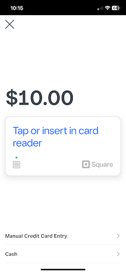 Then the iOS App and the Square Reader will be ready to receive the credit card by either tapping or inserting the credit card into the reader. Also you can choose 2 other ways of collecting a payment for the order: