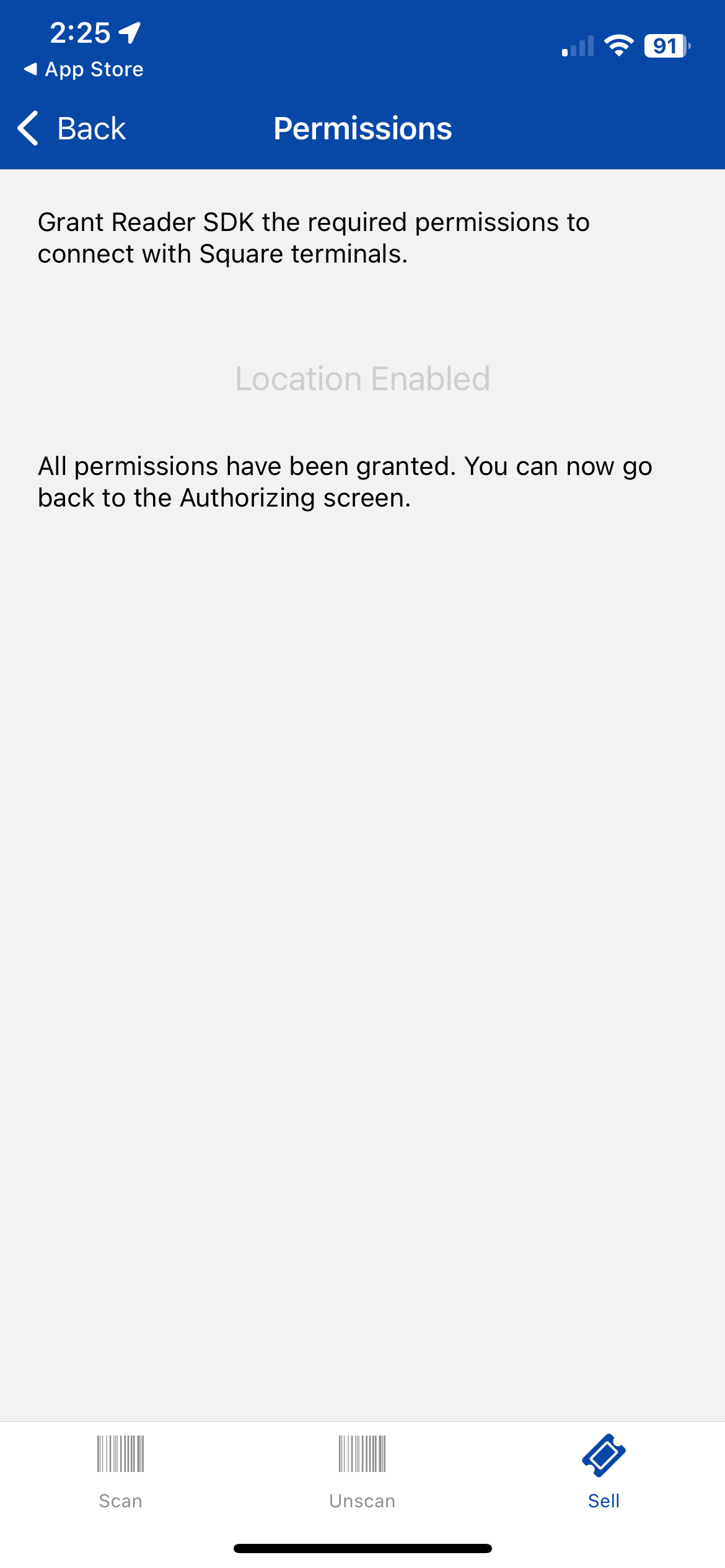 You will be prompted to grant permissions; The first permission is the location as this is required by Square for security reasons. Click on the “Allow While Using App” button.