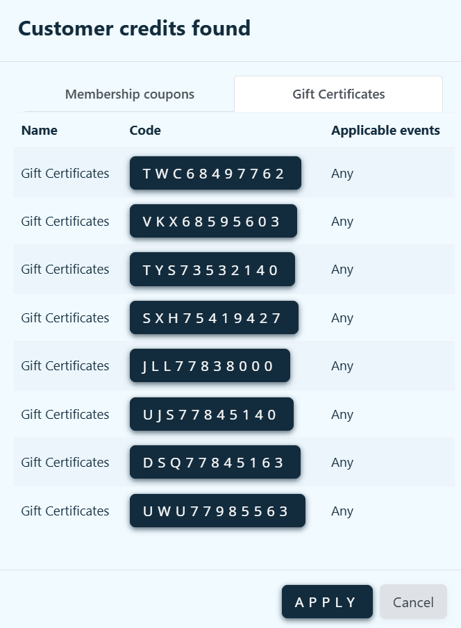 Your customer can also enter in their email address at checkout and if the email address matches what is in ThunderTix, they will be able to apply the gift certificate at checkout. All they need to do is click on the code they wish to apply to their order.