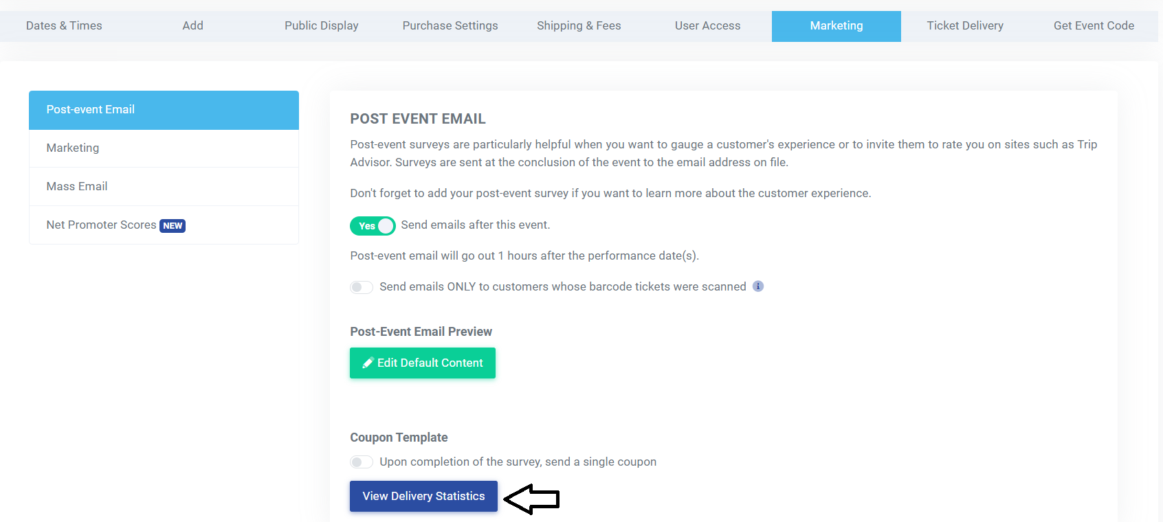 To see statistics on your Post-event Emails head to Event Manager > Click on the name of your event > Marketing > Post-event Email. Towards the bottom of the page, there will be a new button titled 'View Delivery Statistics'. Click on that button to view delivery statistics for your post event emails.