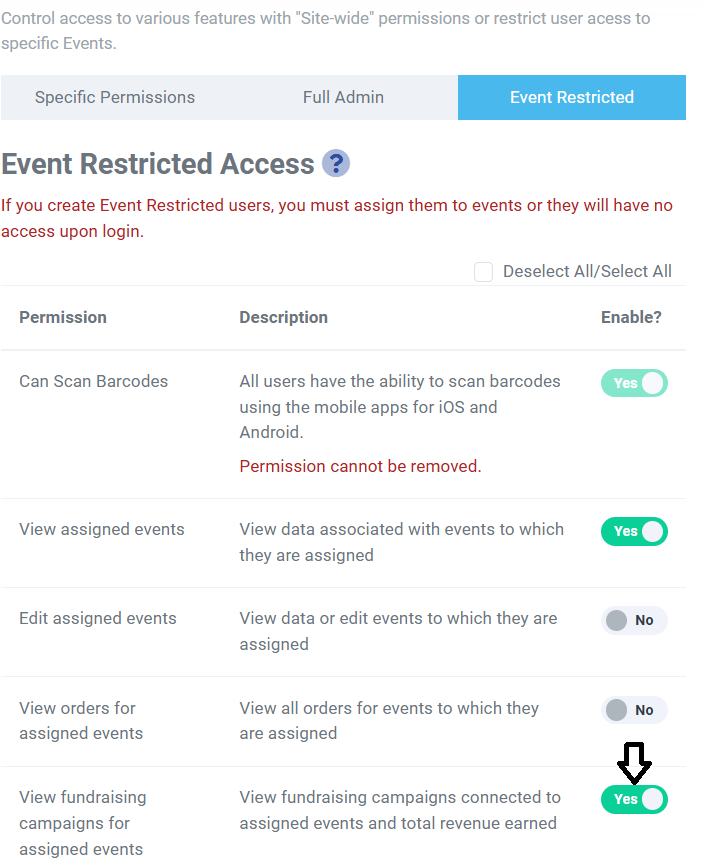 To allow event-restricted users to view fundraising campaigns associated with their assigned events: