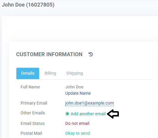 - Under Customer Information > Details, there will be section titled 'Other Emails. Click on the Green +Add another email button to add the additional email.
