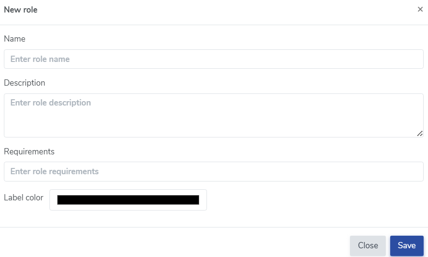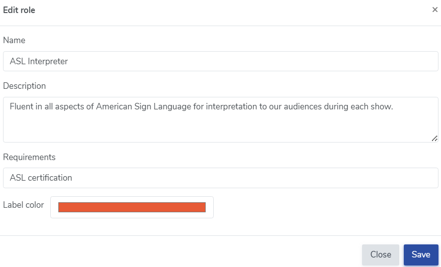 - Enter in the name of the role, a description, and the requirements for the role. For example, if someone is working concessions, they may need to know how to handle cash or process credit card transactions. You can also choose a label color for the role—this is helpful if your organization has multiple volunteer roles.