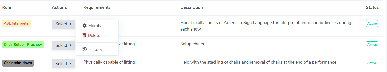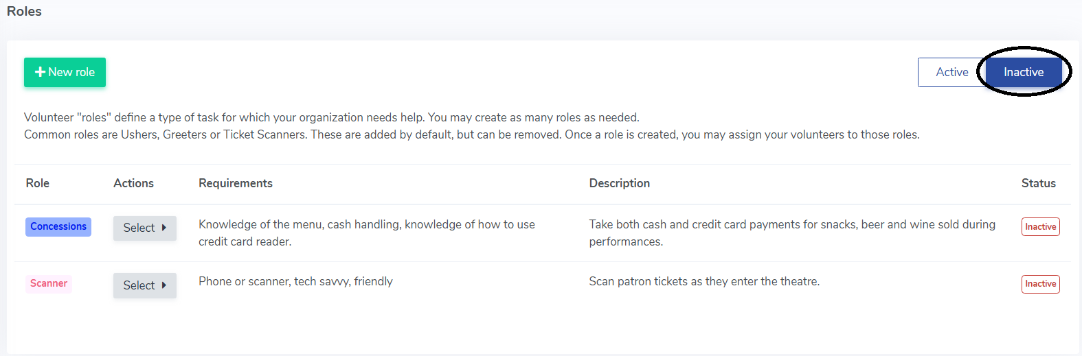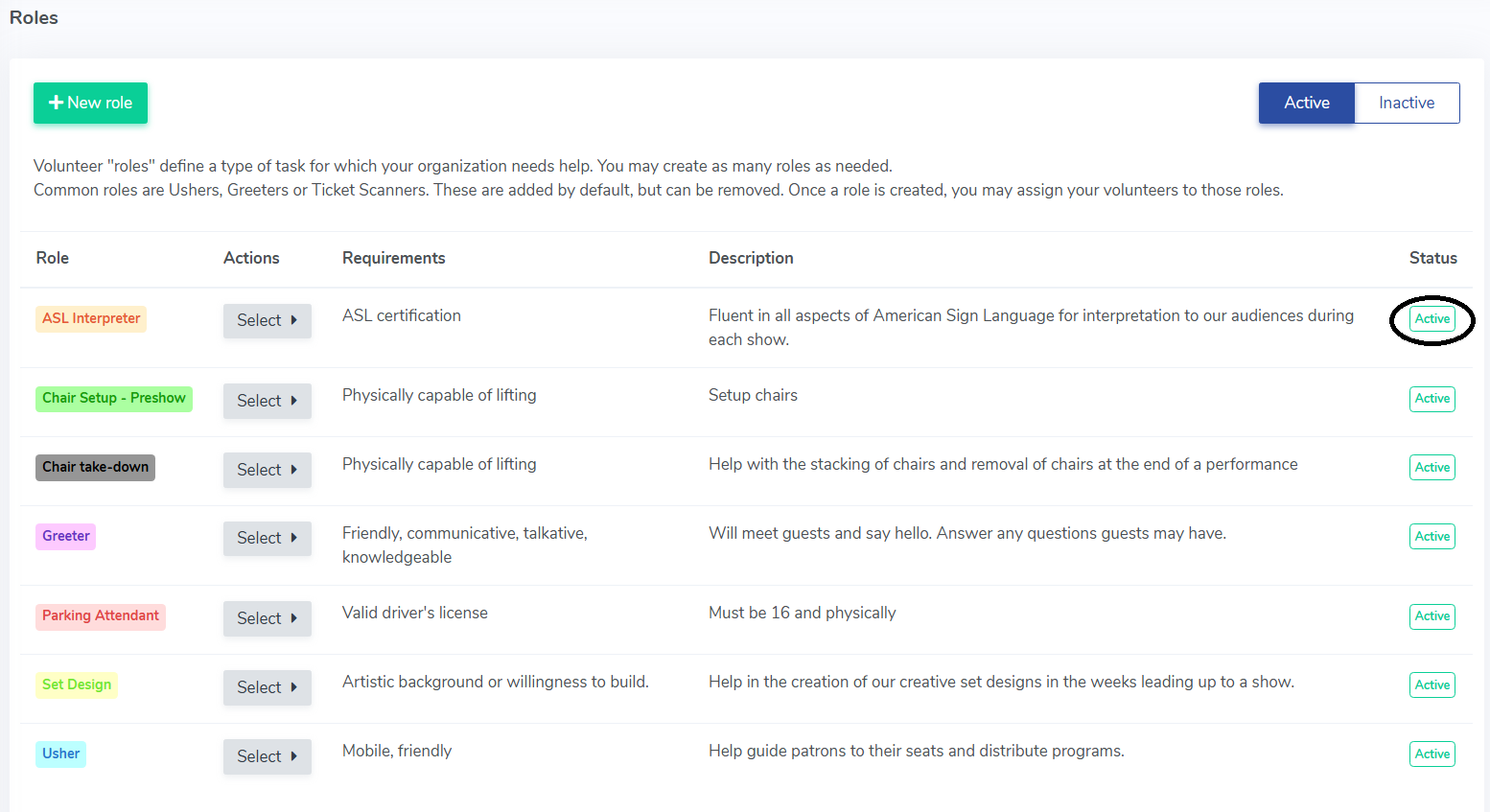 If you need to inactivate a role for any reason, click on the green text that says 'Active' underneath the status column.