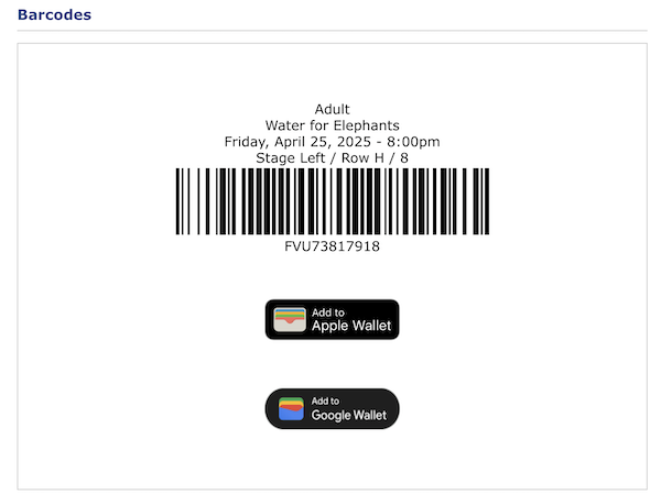 Yes, at the bottom of each confirmation email receipt, where the barcodes are shown, customers now have the option to easily save and store their tickets to their Apple Wallet. When your customers add their tickets to Apple Wallet or Google Wallet, it makes for the quick and easy retrieval of tickets on the night of the show.